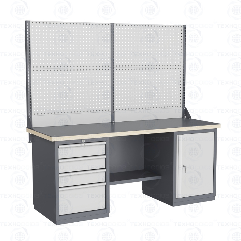 Верстак может комплектоваться одинарным или двойным перфорированным экраном, электромонтажным блоком для установки розеток и дополнительных устройств, а также комплектом освещения с держателем и лампой. Перфорация экрана подходит под стандартные держатели для инструментов, отверток, крючков, полок. Возможна комплектование верстака навесным элементами (держатели, крючки, полки).