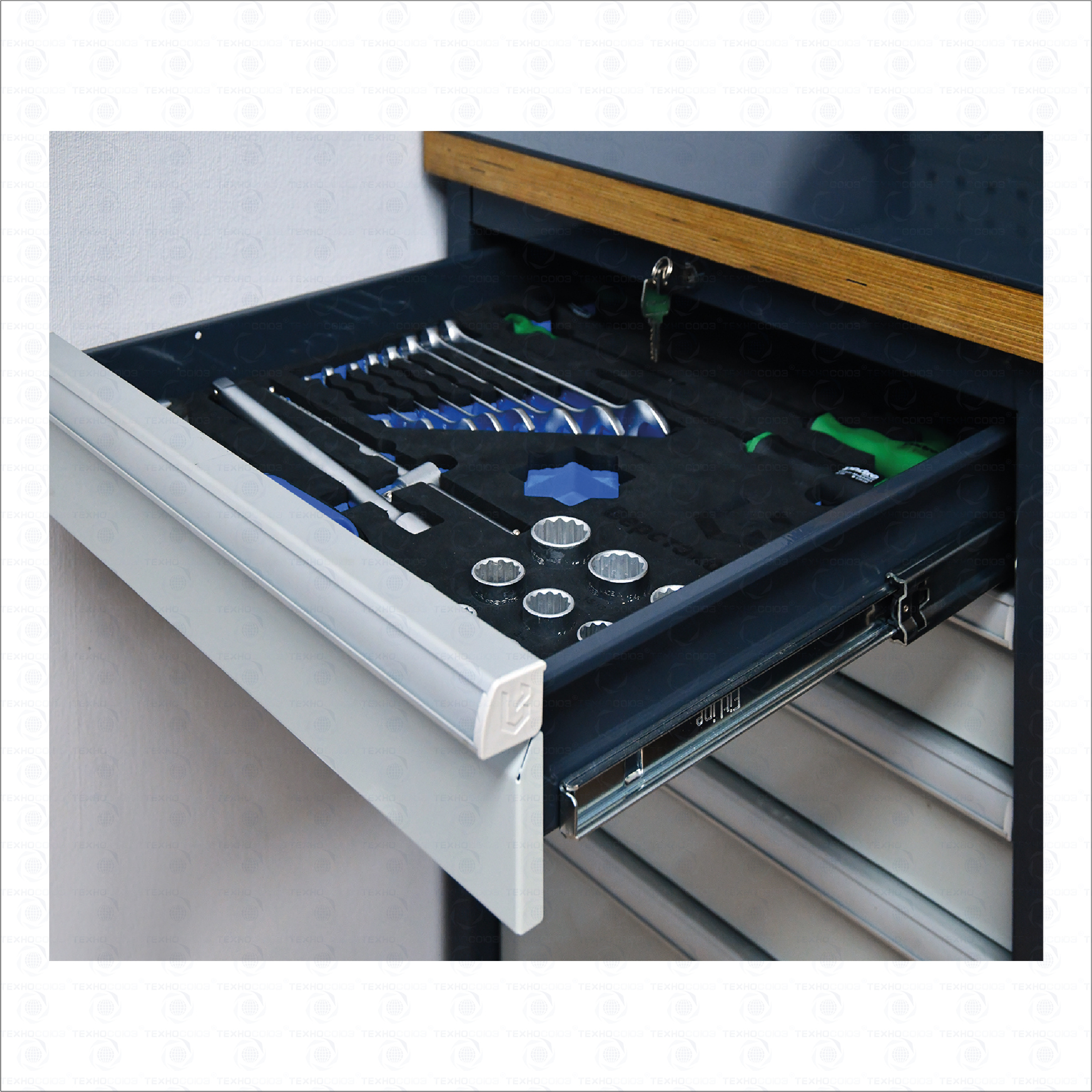 Тумбы и опоры верстаков выполнены из профилированной холоднокатаной стали и имеют сварную конструкцию. Возможна установка любых сочетаний тумб с различным количеством выдвижных ящиков, а также с дверцей и полками. Между тумбами и опорами возможна установка полки-стенки. На каждой ручке ящика и двери закреплен специальный алюминиевый профиль с отделением для установки маркировки. На тумбы с выдвижными ящиками установлена система антиопрокидывания, которая ограничивает выдвижение остальных ящиков тумбы, если один из ящиков выдвинут. Ящики снабжены специальными усиленными шариковыми направляющими. Тумбы снабжены центральной системой запирания.