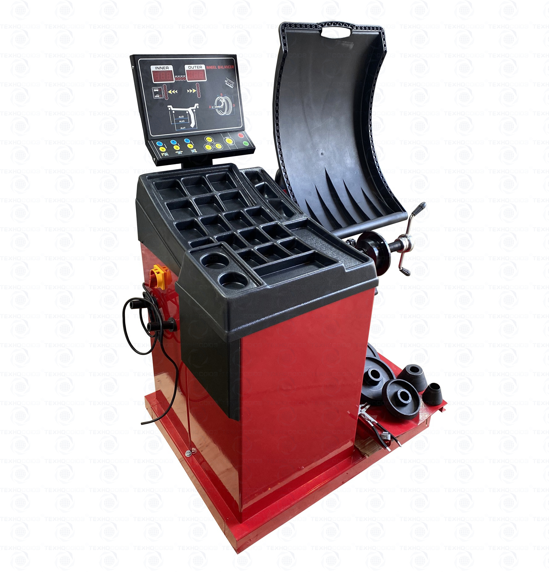 • Балансировочный станок оснащен защитным кожухом для защиты оператора от попадания частиц грязи из протектора покрышки.