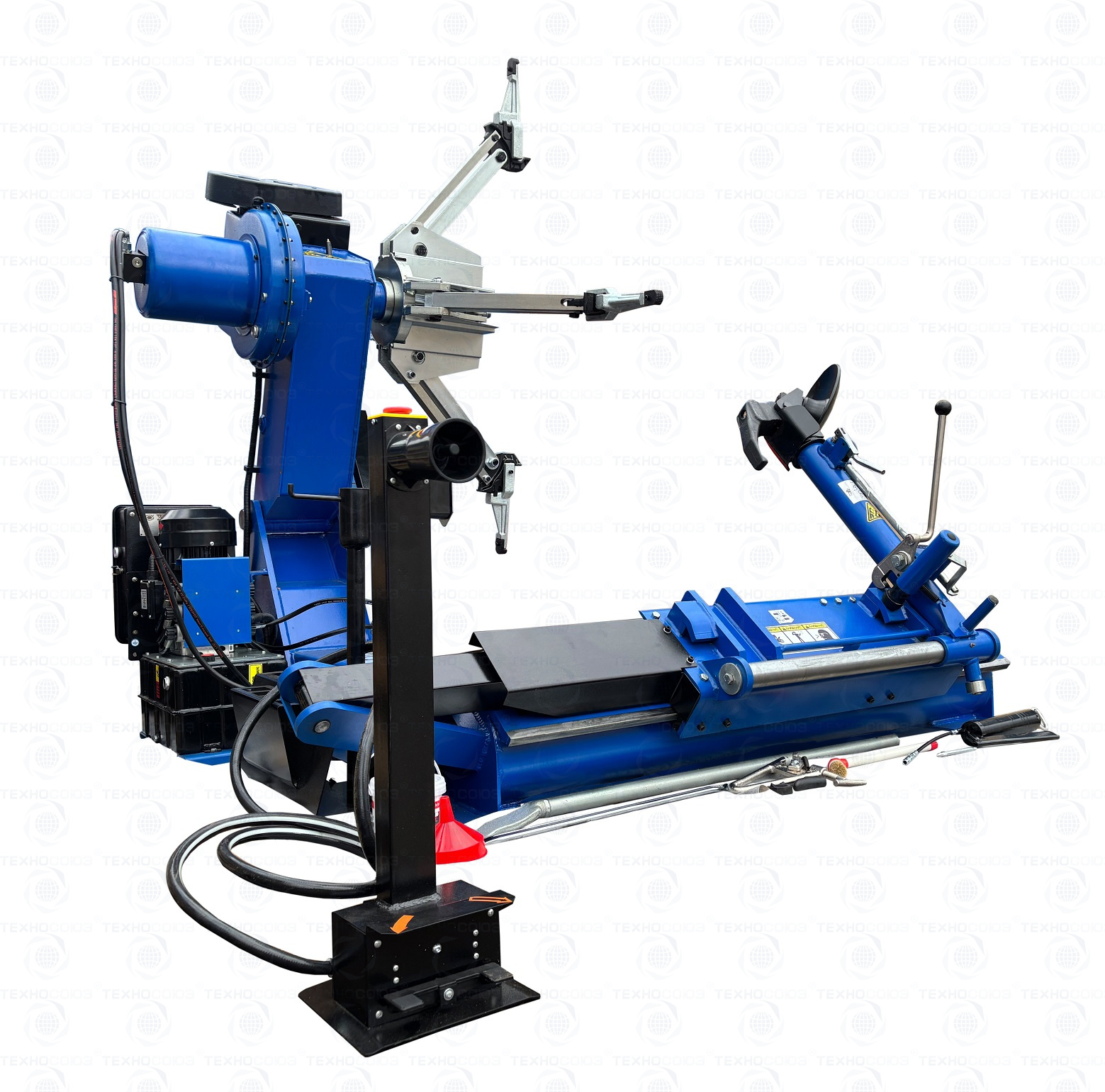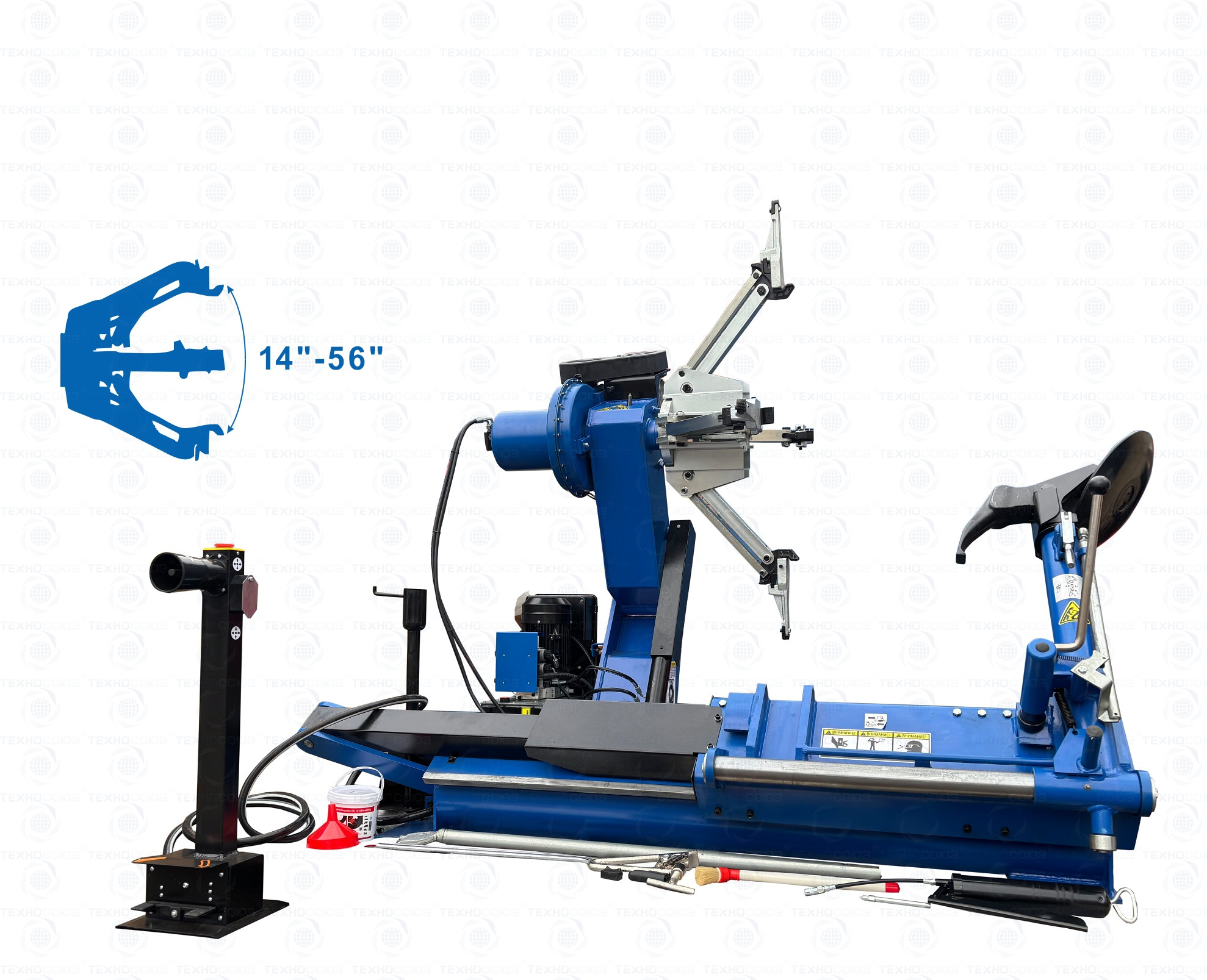 Моторы 2,2 + 2,2 кВт, 380В. В комплекте: Немецкий насос «Bucher hydraulics». Гарантия до 18 мес. Диски  с расширителями 14÷56”. Максимальное колесо Ø2300 мм, делает колеса "спарку" с шириной диска до 1050 мм. Вес колеса до 1600 кг. Отжим min-max. 2800-5265Н/м. Грузовой шиномонтажный станок для тракторов, сельхозтехники, еврофур и т.п.