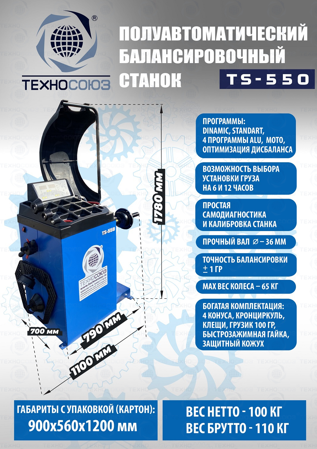 TS-550 Балансировочный станок (с лазером) с диаметром диска с резиной до 800 мм. Размеры диска: ширина 3–10” (76-254 мм) , диаметр диска 10–24” (254÷609 мм). Режимы работы DINAMIC, STATIC, ALU1, ALU2, ALU3, ALUS, ST. Автокалибровка. Гарантия 12 мес. В комплекте: кожух с автозапуском + клещи + кронциркуль + быстрозажимная гайка + набор конусов.