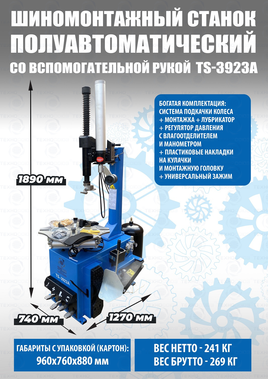 Шиномонтажного станка TS-3923A для колес легковых автомобилей, легких грузовиков. Для дисков: 12÷24”. В комплекте: вспомогательная рука для работы с низкопрофильными шинами и RanFlat + встроенный бустер 24 литра (взрывная подкачка) + пистолет для подкачки шин + монтажка + регулятор давления с влагоотделителем и манометром.