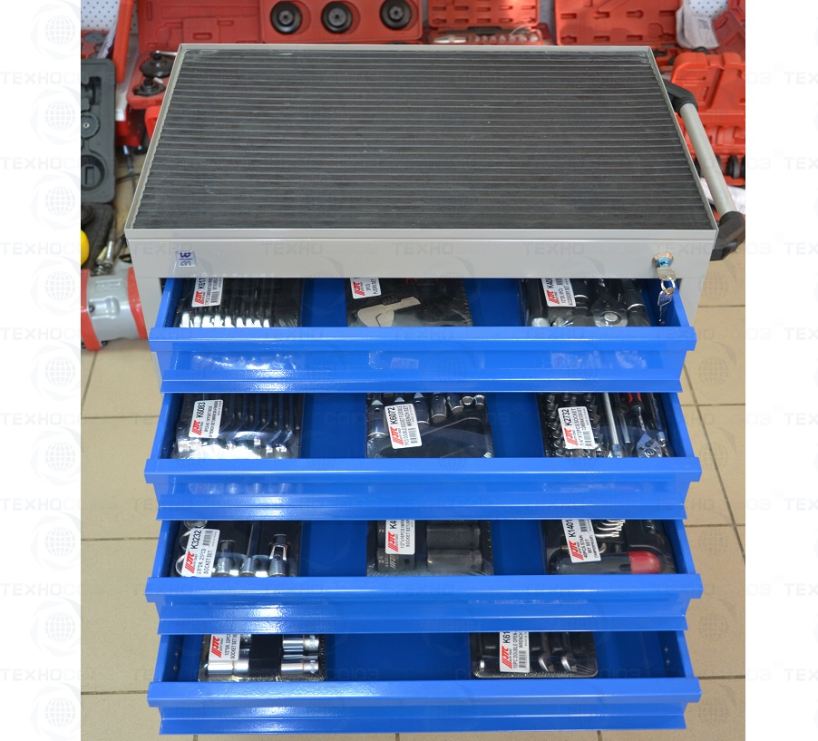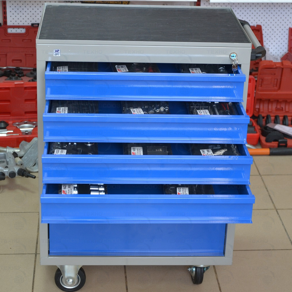 В данный комплект инструмента Макси входит тележка инструментальная с 7 ящиками, набор для удаления любого крепежа, разрезные, накидные, комбинированные и рожковые ключи, набор шестигранников TOPX и бит, наборы головок и отверток, клещи, бокорезы, утконосы, щипцы и набор трещоток и напильников - в этой тележке есть все и немного больше! Применяется при работе на дилерских СТО.