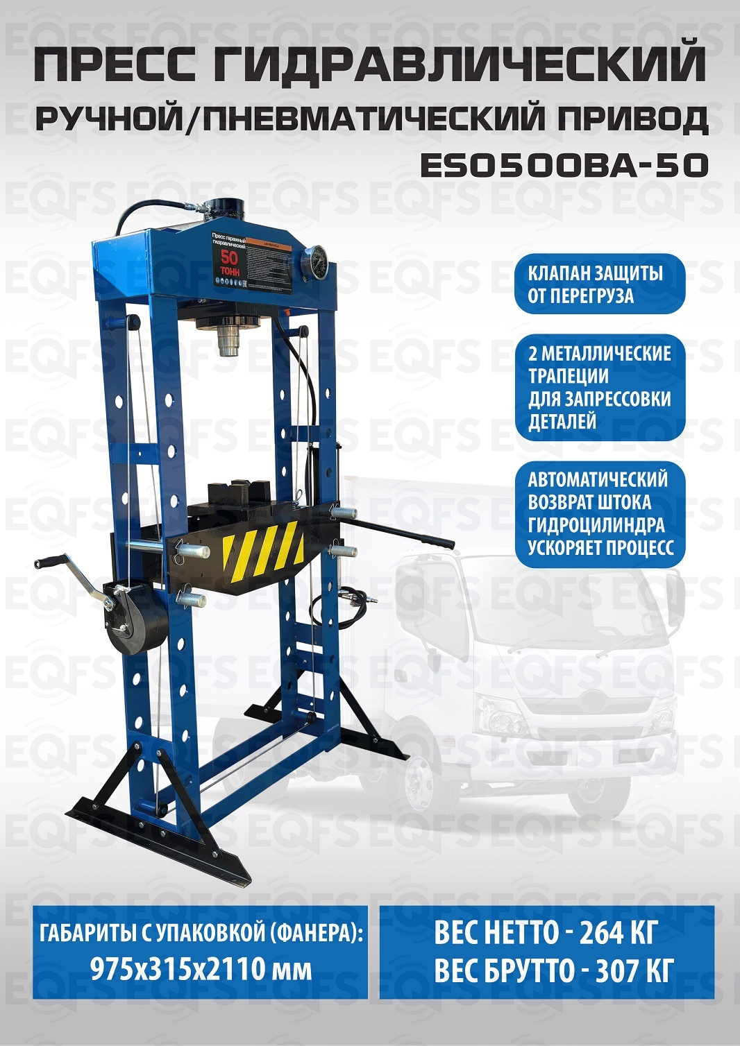 Пресс пневмогидравлический 50 тонн, 264кг. металла, полностью сварная рама, управление ручное/пневматическое. Гидроцилиндр с пуансоном перемещается по ширине каретки, клапан защиты от перегрузки, манометр, ручная лебедка. Ход поршня 220 мм. Рабочее окно 730х1290 мм. Рекомендуется для выпрессовки подшипников, деталей машин, втулок и т.п. в автосервисе, гараже и СТО. Цвет синий. Доставка РФ, РБ, Армения, Казахстан, Киргизия.