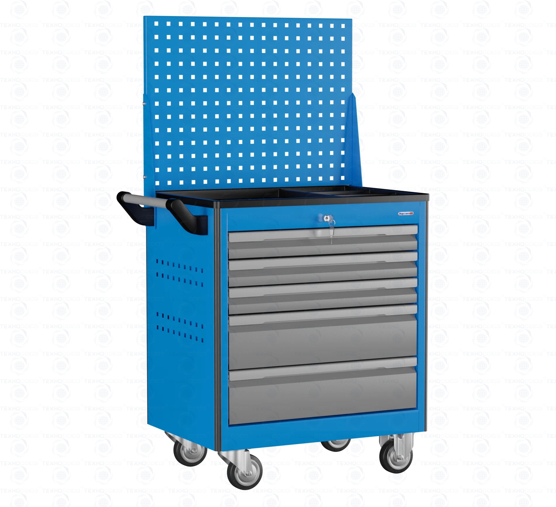 Тележка снабжена центральным замком с поворотом ригеля 180 градусов, который закрывает одновременно все ящики. Замок неподвижно и прочно закреплен на корпусе тележки. В комплекте имеется два ключа. Тяга замка подпружинена.